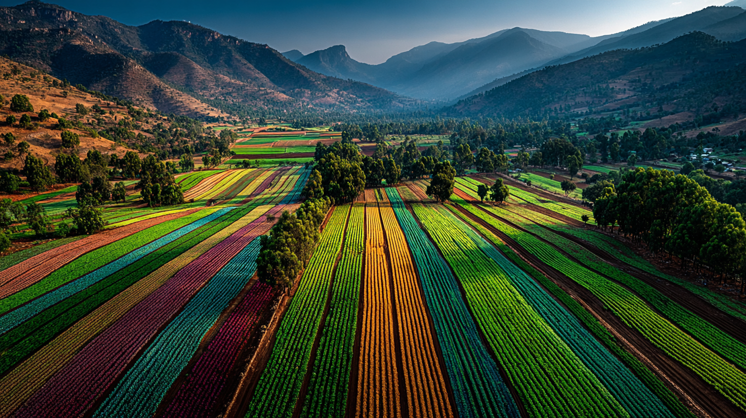 Panoramic view of colorful agricultural fields stretching toward mountains